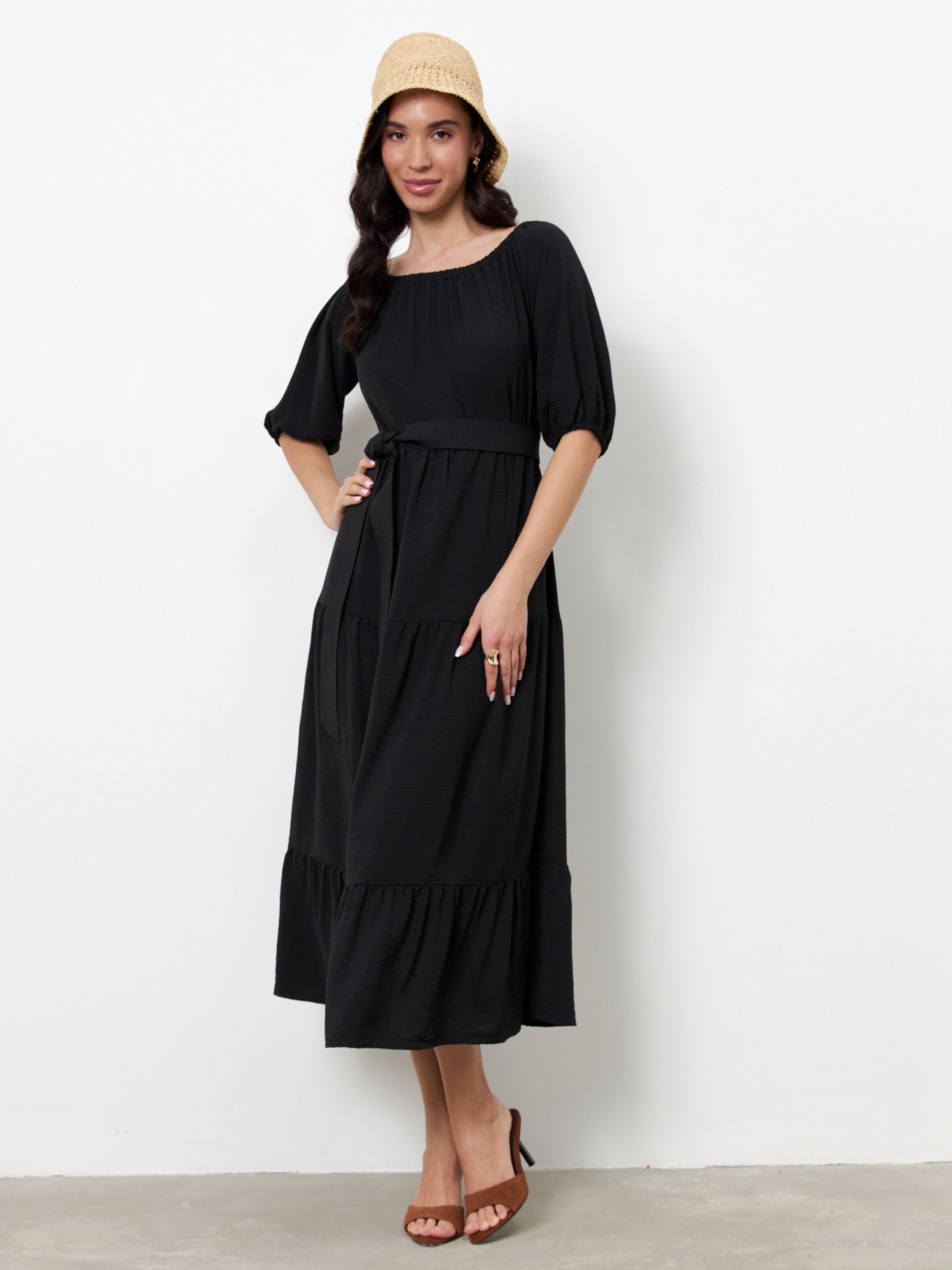 Платье свободного силуэта из ткани с крэш-эффектом, отрезное по линии талии. Нижняя части платья с воланами. Рукав-реглан до локтя. По низу рукава сборка на резину. Линия плеча и линия горловина оформлены сборкой на резину. В комплекте пояс из основной ткани.