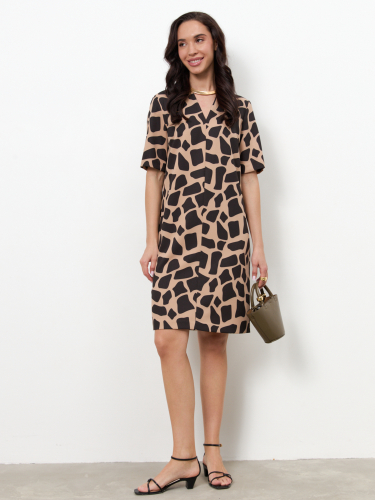 Платье свободного силуэта из плательной ткани. По центру передней части изделия выполнен шов. Цельнокроеная стойка, переходящая в V-образный вырез горловины, визуально делает фигуру стройнее. Втачной короткий рукав.
