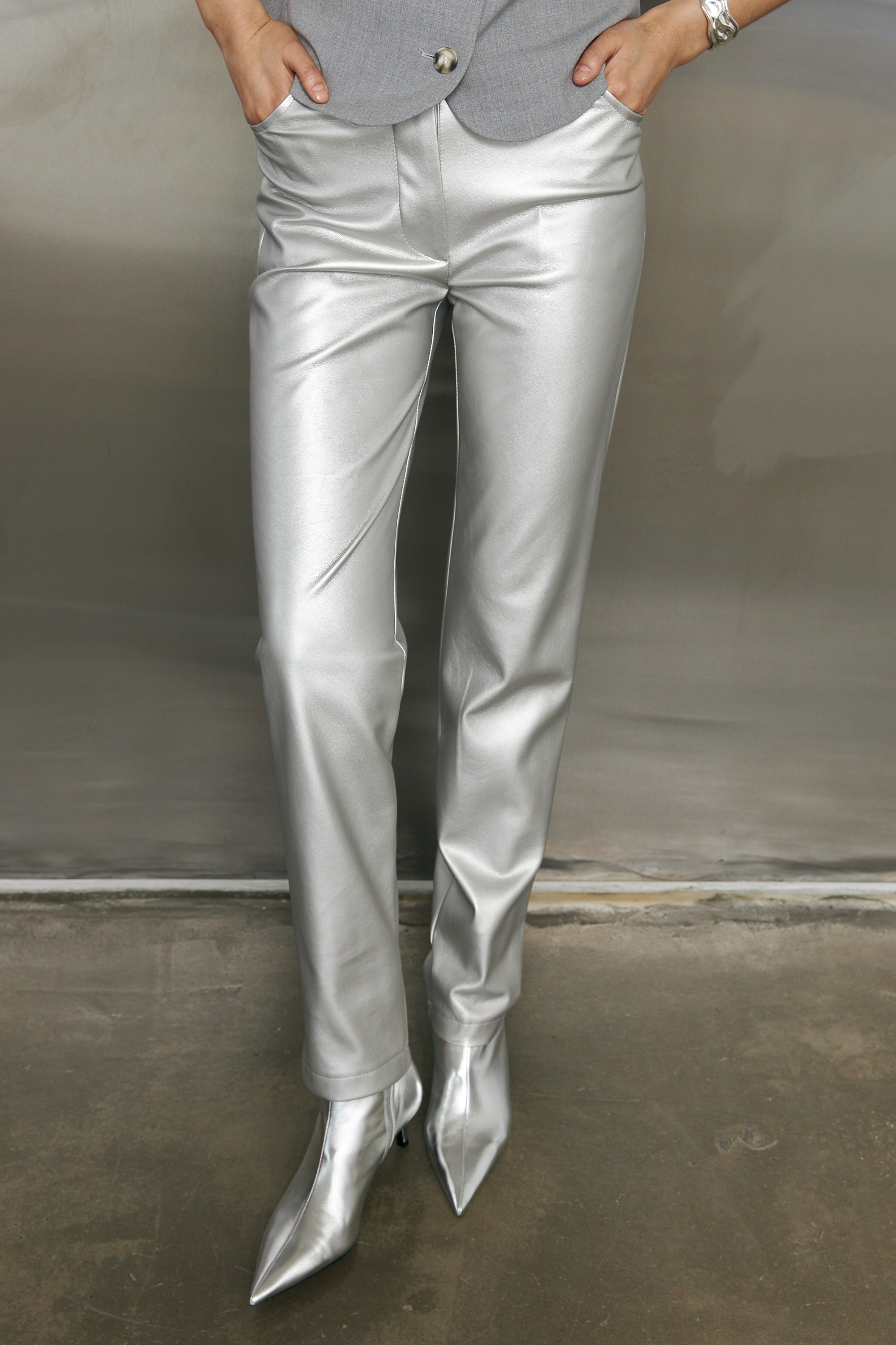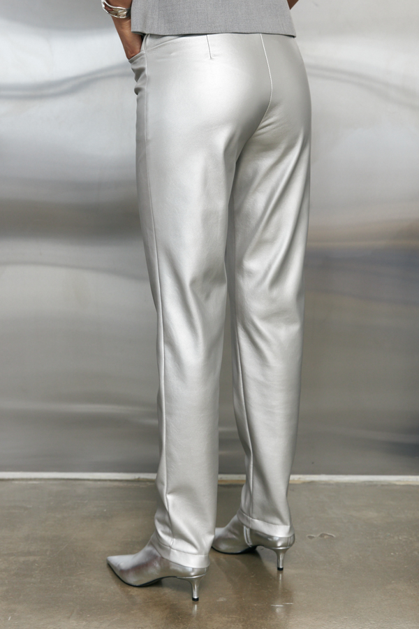 Брюки из эластичного полотна, с покрытием, имитирующим кожу, зауженные книзу. На передней части брюк карманы с подкройным бочком. Притачной пояс, застёжка на металлическую молнию-гульфик и кнопку.
