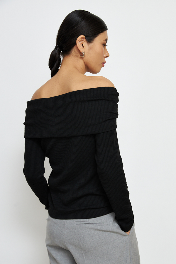 Модный джемпер с открытыми плечами из фактурного эластичного полотна. Линия плеч с эластичной резинкой. Длинный рукав реглан. Крой этого изделия позволяет создавать разные варианты ношения - на одно плечо или декольте.