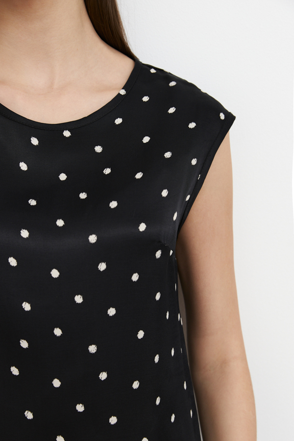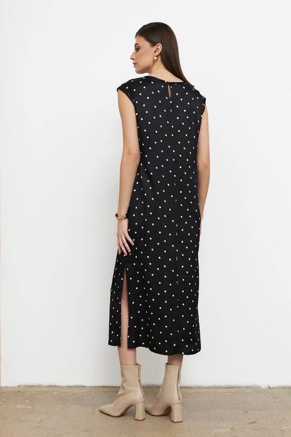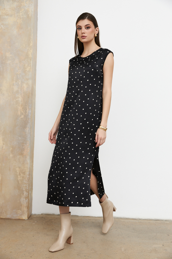 Платье из вискозной ткани с сатиновым блеском. Полуприлегающий силуэт, с разрезом в боковом шве. По среднему шву спинки застёжка на петлю-пуговицу. Круглый вырез горловины и линия проймы окантованы косыми бейками из основной ткани.