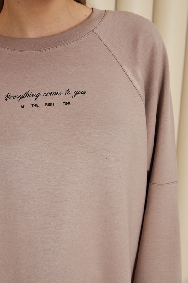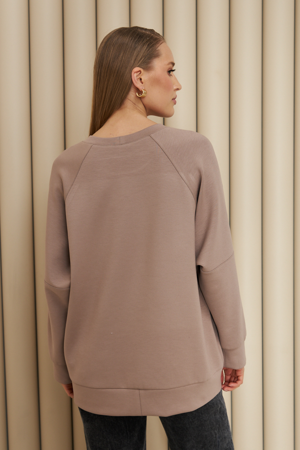 Свитшот свободного силуэта из эластичного полотна. Круглый вырез горловины оформлен бейкой. Рукав реглан с горизонтальным швом в области локтевого сгиба. По низу изделия и рукавов выполнены притачной пояс и манжеты из основной ткани. В таблице размеров представлены параметры человека, а не изделия.