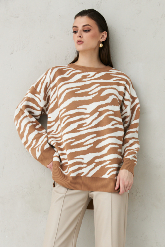 Джемпер свободного силуэта из эластичного полотна. На детали полочки цельнокроеные длинные завязки. Вырез глубокий, V-образный. Втачной рукав в спущенную пройму. Длина джемпера до линии талии.