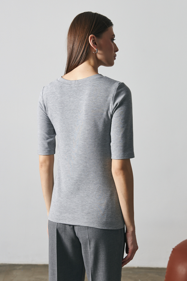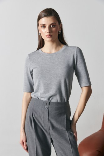 Джемпер прилегающего силуэта из меланжевого эластичного полотна. Втачной короткий рукав. Круглый вырез горловины оформлен бейкой. Джемпер – это хорошая базовая вещь, подходящая для любого гардероба.