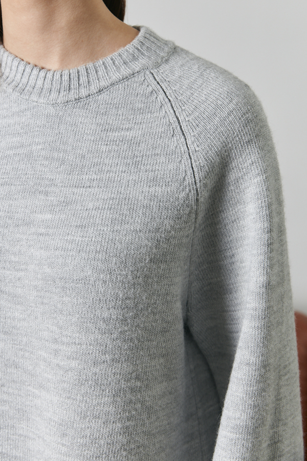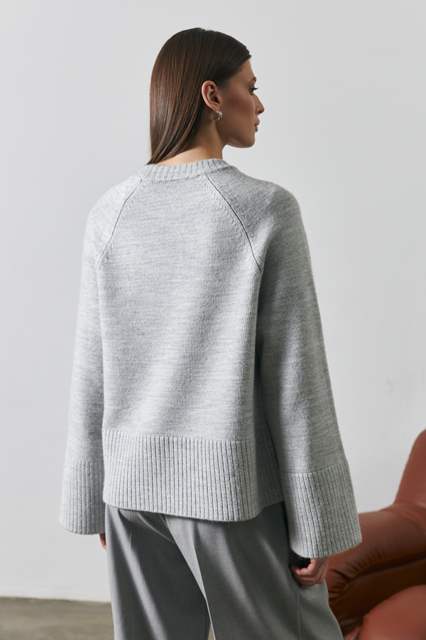 Джемпер свободного силуэта. Длинный рукав-реглан, чуть расширенный книзу. Круглый вырез горловины оформлен резинкой, низ изделия и низ рукава-высокой резинкой. Изделие выполнено из мягкой меланжевой пряжи.