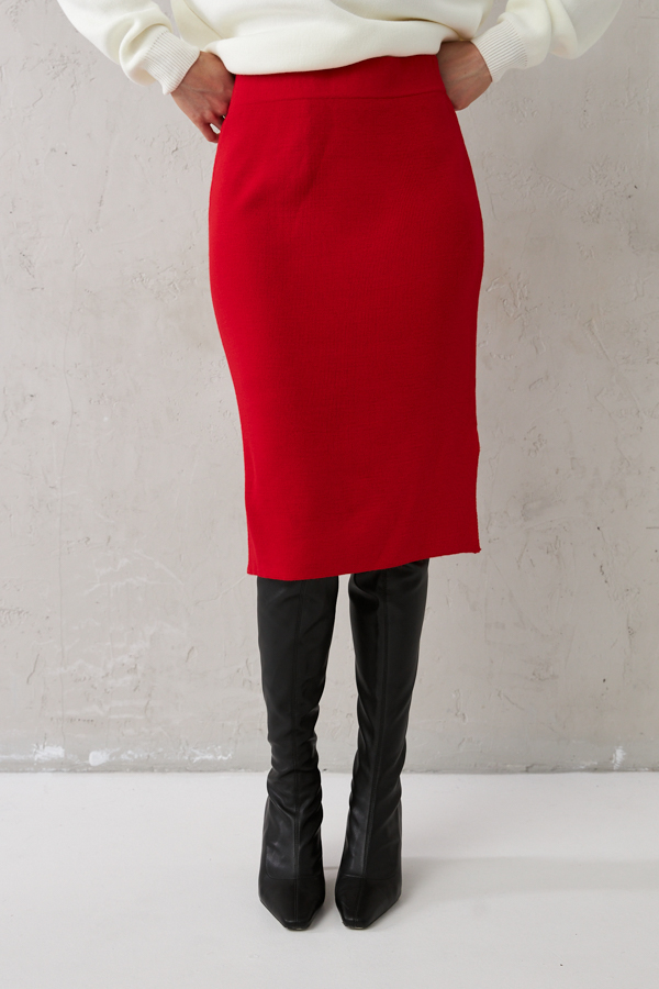 Юбка прилегающего силуэта с эластичным поясом и разрезом в боковом шве. Изделие выполнено из мягкой структурированной пряжи.