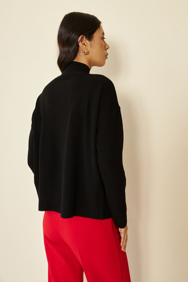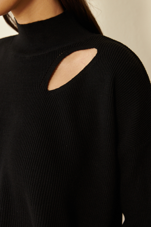 Джемпер свободного силуэта с декоративным вырезом в области плеча. Рукав втачной в спущенную пройму. Вырез горловины оформлен воротником-стойкой. Изделие выполнено из мягкой структурированной пряжи.
