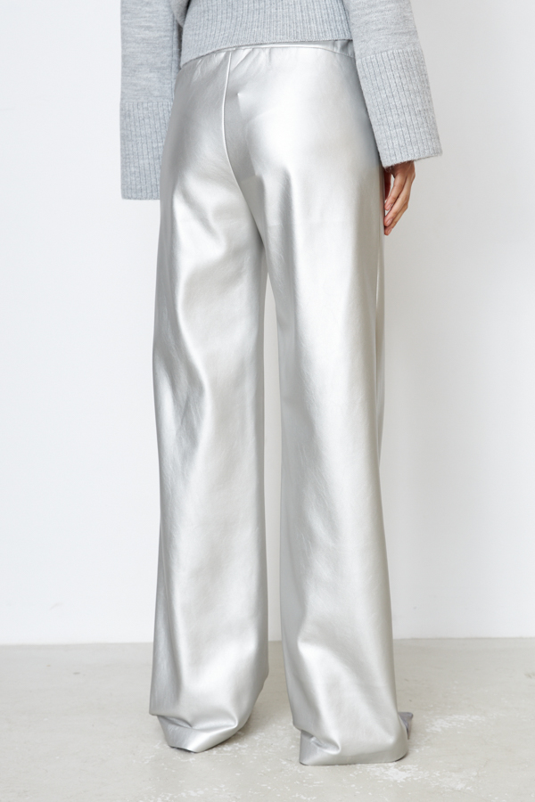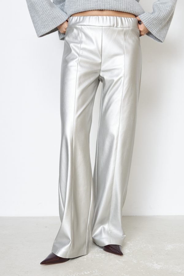 Брюки прямого силуэта из эластичного полотна, с покрытием, имитирующим кожу. По центру передней части брючин выполнен шов с декоративной строчкой. Пояс с эластичной резиной.