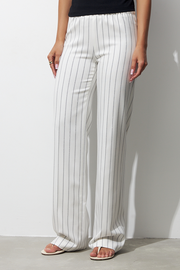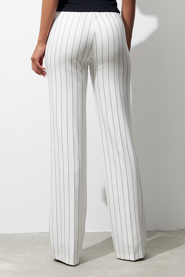 Брюки прямого силуэта из костюмной ткани. Пояс притачной с эластичной резиной.