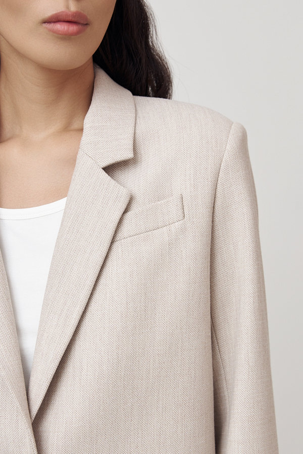 Жакет прямого силуэта с разрезами в боковых швах из меланжевой костюмной ткани. Изделие с английским воротником и застежкой на пуговицу. На передней части жакета выполнен нагрудный карман с листочкой и карманы в рамку. Втачной длинный рукав, снизу шлица с пуговицами. Изделие идеально держит форму, имеет четкую линию плеча благодаря плечевым накладкам. Жакет на подкладке.