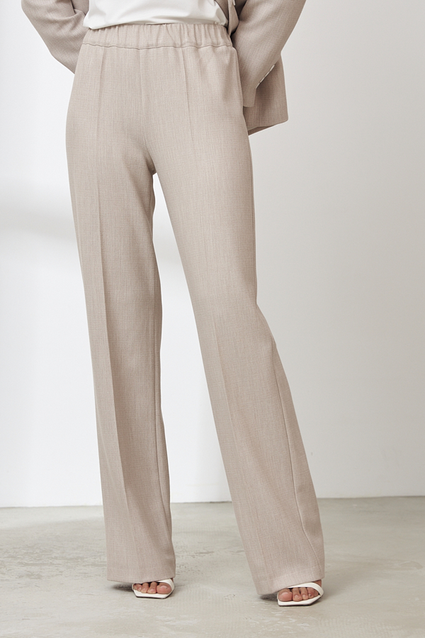 Брюки прямого силуэта из меланжевой костюмной ткани. Пояс притачной с эластичной резиной.