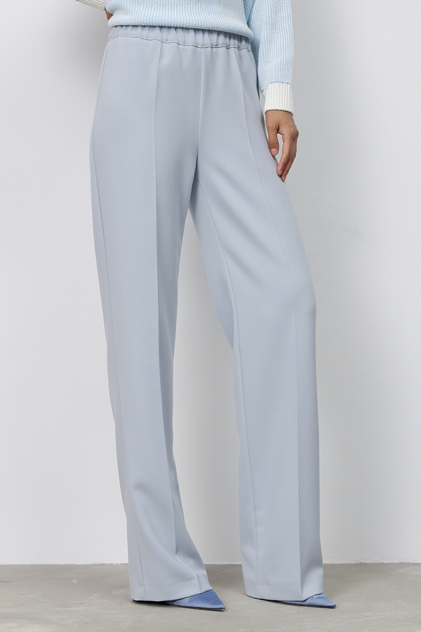 Брюки прямого силуэта из костюмной ткани. Пояс притачной с эластичной резиной.