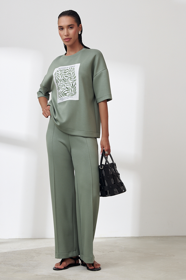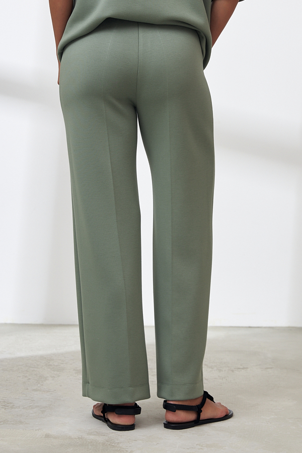 Брюки прямого силуэта из эластичного полотна. Пояс притачной с эластичной резиной. На передней части брюк застрочены стрелки.