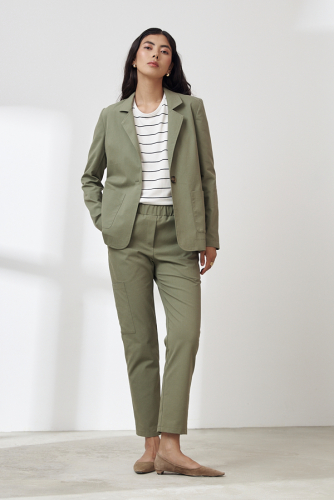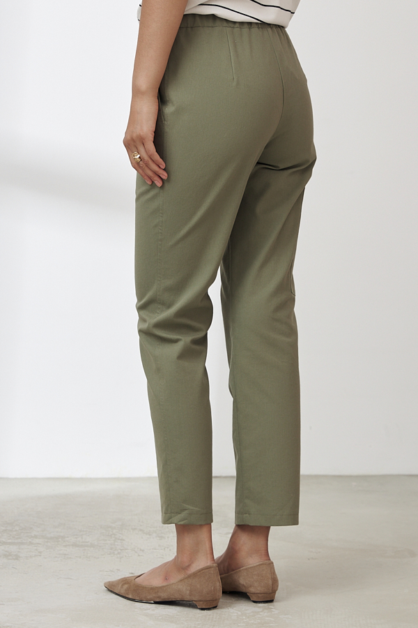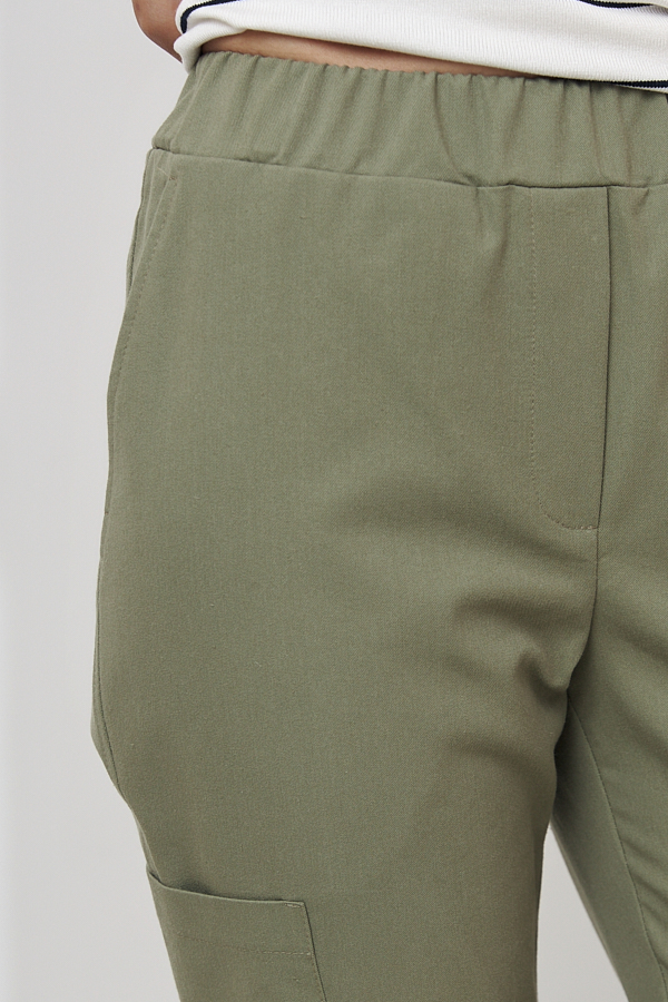 Брюки из хлопковой ткани, зауженные книзу. В боковых швах выполнены карманы с подкройным бочком. Пояс с эластичной резиной. На передней части брюк имитация гульфика, на бедре-оригинальный карман.