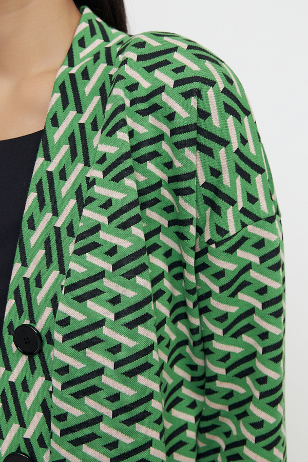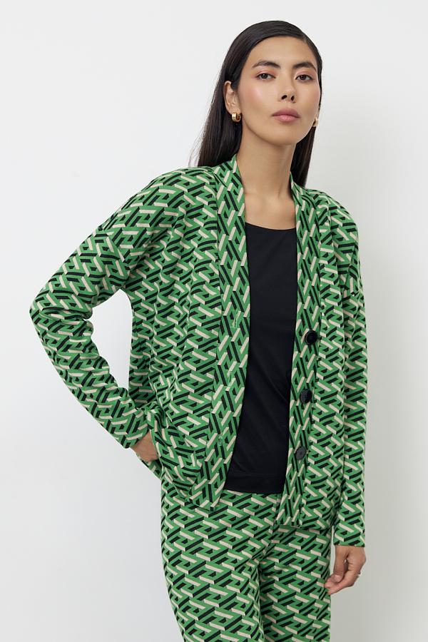 Костюм выполнен из эластичной ткани с жаккардовым узором. Брюки прямого силуэта. Пояс притачной с эластичной резиной. Кардиган свободного силуэта с притачной планкой и застёжкой на пуговицы. Втачной длинный рукав в спущенную пройму.