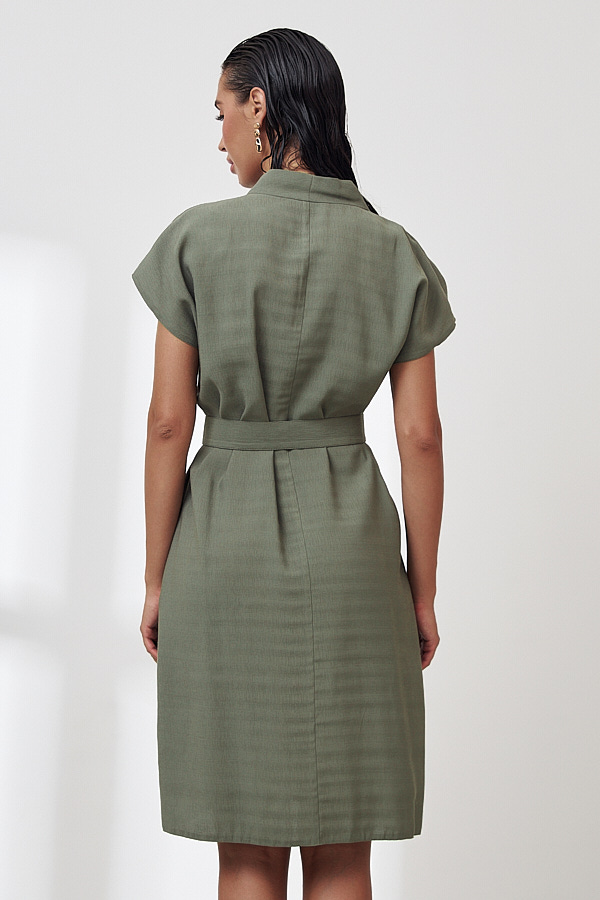 Платье из вискозной ткани с крэш-эффектом. Свободный силуэт с карманами в боковых швах. По центру передней и задней части изделия выполнен шов. Цельнокроеная стойка, переходящая в V-образный вырез горловины, визуально делает фигуру стройнее. Цельнокроеный короткий рукав. В комплекте пояс из основной ткани.