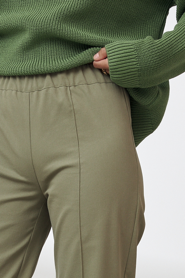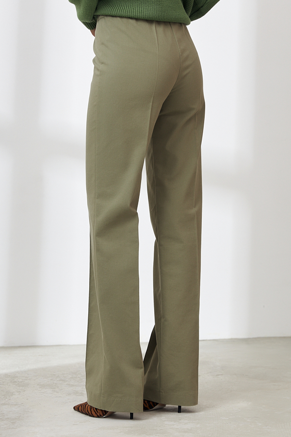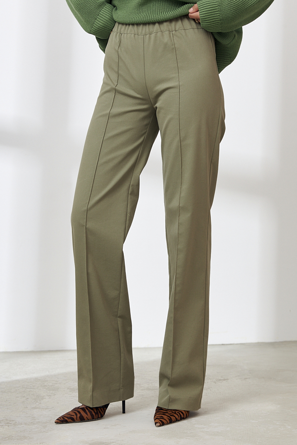 Брюки прямого силуэта из хлопковой ткани. Пояс притачной с эластичной резиной. На передней части брюк застрочены стрелки.