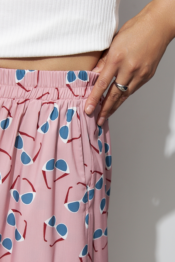 Брюки прямого свободного силуэта из вискозной ткани. Пояс притачной с эластичной резиной, в боковых швах карманы.