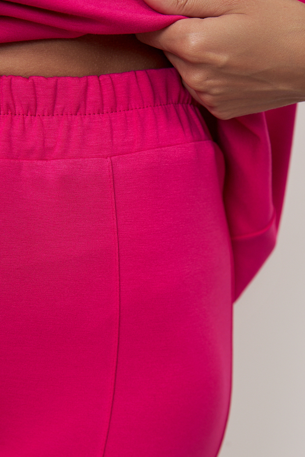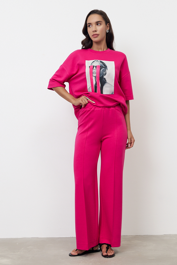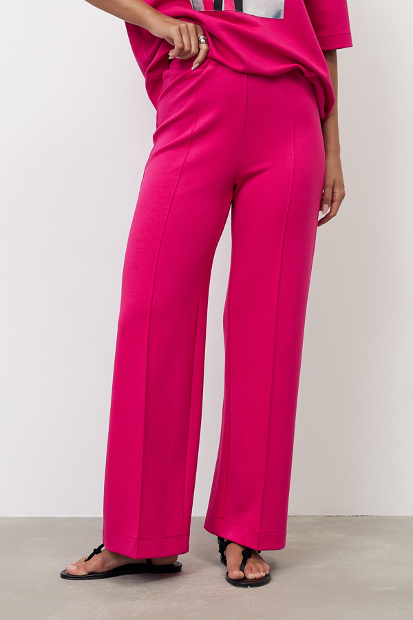 Брюки прямого силуэта из эластичного полотна. Пояс притачной с эластичной резиной. На передней части брюк застрочены стрелки.
