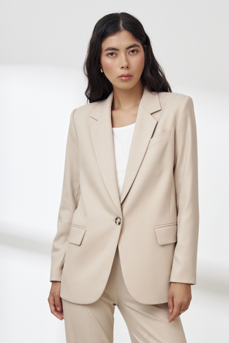 Жакет полуприлегающего силуэта из костюмной ткани. Изделие с английским воротником и застежкой на пуговицу. На передней части жакета выполнен нагрудный карман с листочкой и карманы в рамку с клапаном. По центру задней части выполнена шлица - элемент декоративный и необходимый. Обеспечивает свободу движения, добавляет шику и элегантности. Втачной длинный рукав, снизу имитация шлицы с пуговицами. Изделие идеально держит форму, имеет четкую линию плеча благодаря плечевым накладкам. Жакет на подкладке.