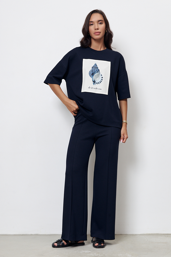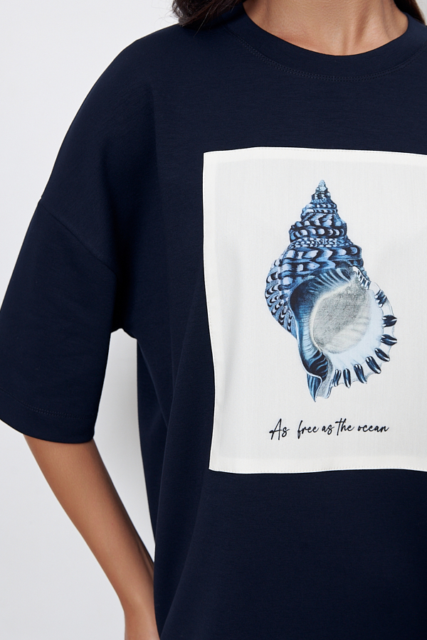 Джемпер свободного силуэта со спущенной линией плеча и рукавом до локтя выполнен из эластичного полотна. Вырез горловины оформлен бейкой из основной ткани. На передней части изделия выполнена аппликация. В таблице размеров представлены параметры человека, а не изделия.