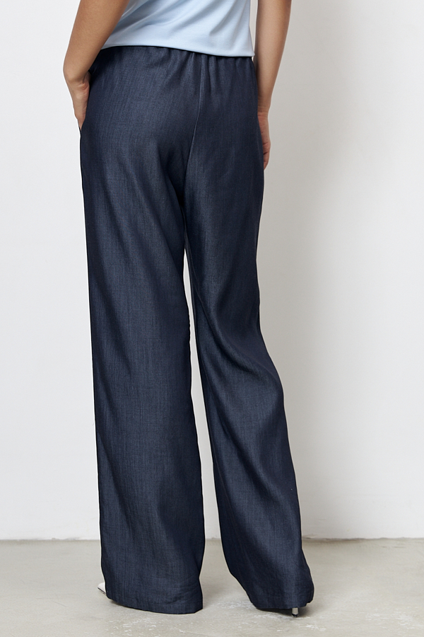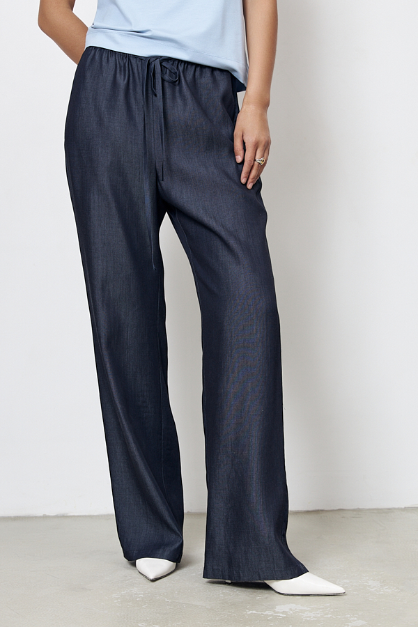 Брюки прямого силуэта из ткани Tencel. Пояс с эластичной резиной и кулиской, в боковых швах карманы.