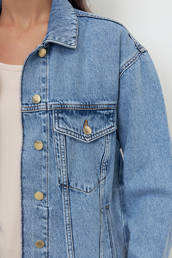 Джисовая куртка из денима выполнена по классической джинсовой технологии. Свободный силуэт с застёжкой на пуговицы. Изделие со спущенной линией плеча и длинным рукавом на манжете с застёжкой на пуговицы. Вырез горловины обработан отложным воротником на стойке. На передней части выполнены карманы с листочкой и накладные карманы с клапаном в области груди. Швы оформлены декоративными строчками.
