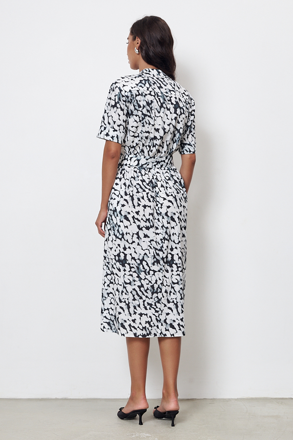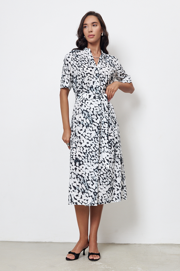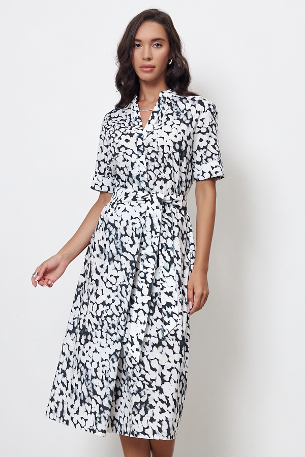 Платье свободного силуэта из плательной ткани. Изделие отрезное по линии талии с резинкой. Лиф платья с запахом, фиксируется на пуговицу для удобства. На передней части юбки выполнена складка, имитирующая запах, в боковых швах карманы. Линия горловины оформлена воротником-стойкой. Втачной короткий рукав с отворотом. В комплекте пояс из основной ткани.