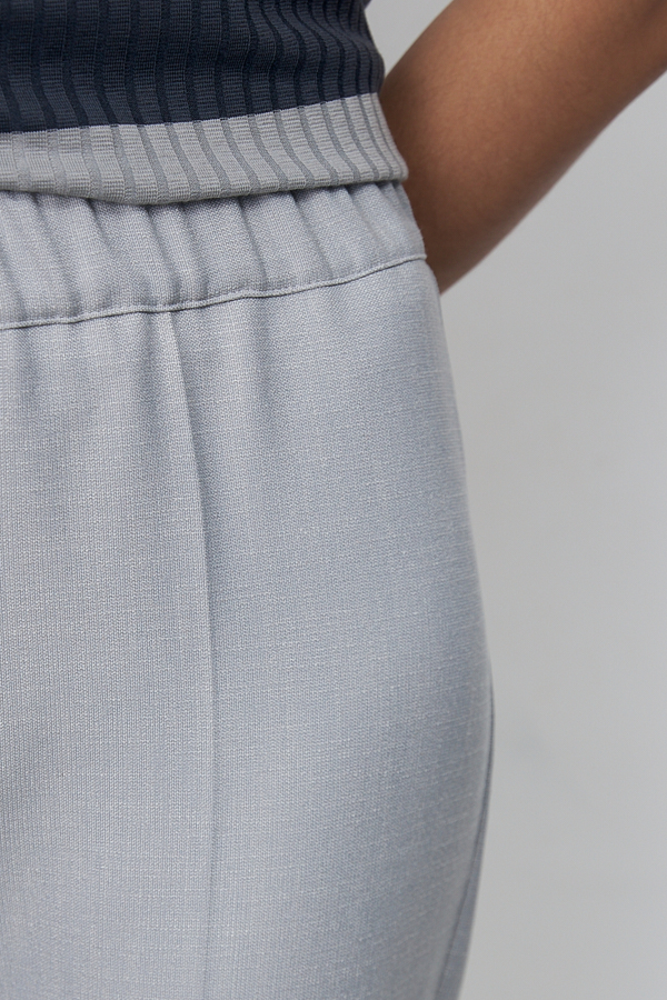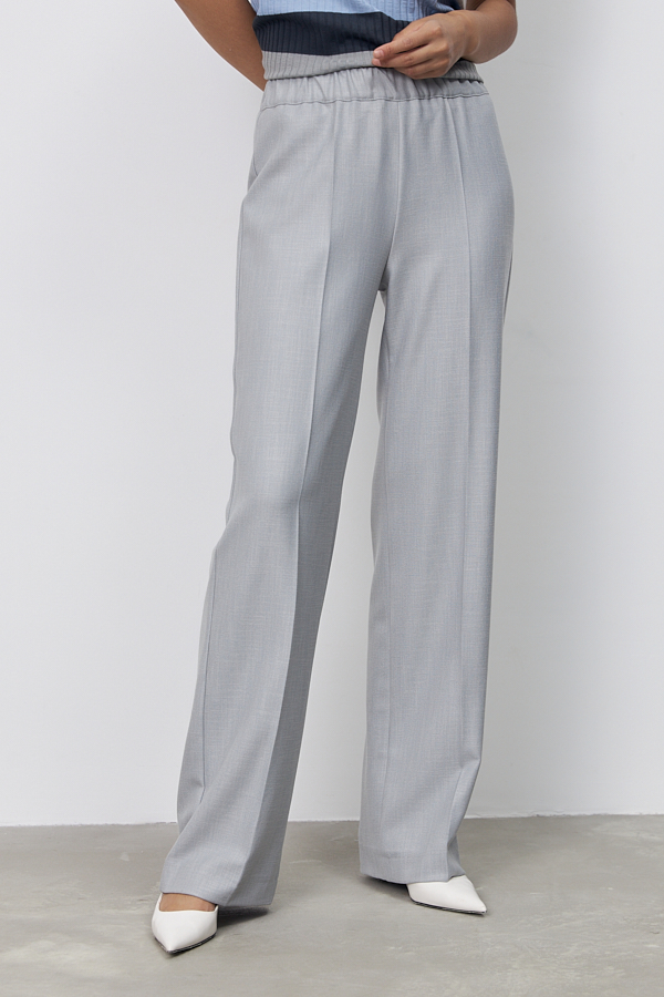 Брюки прямого силуэта из меланжевой костюмной ткани. Пояс притачной с эластичной резиной.