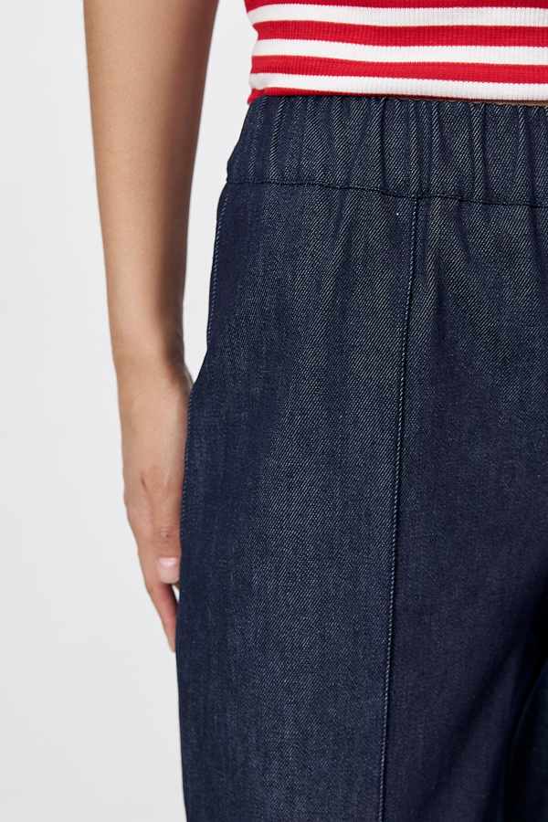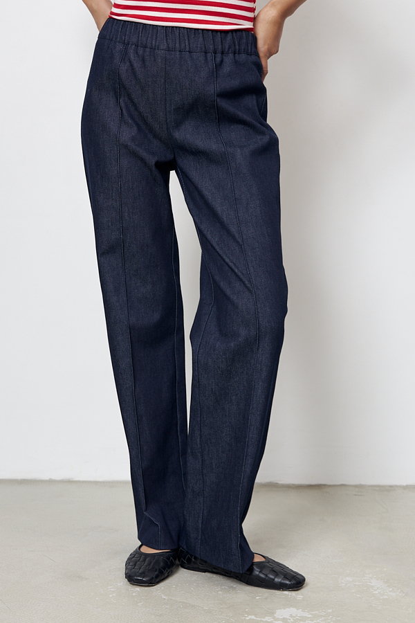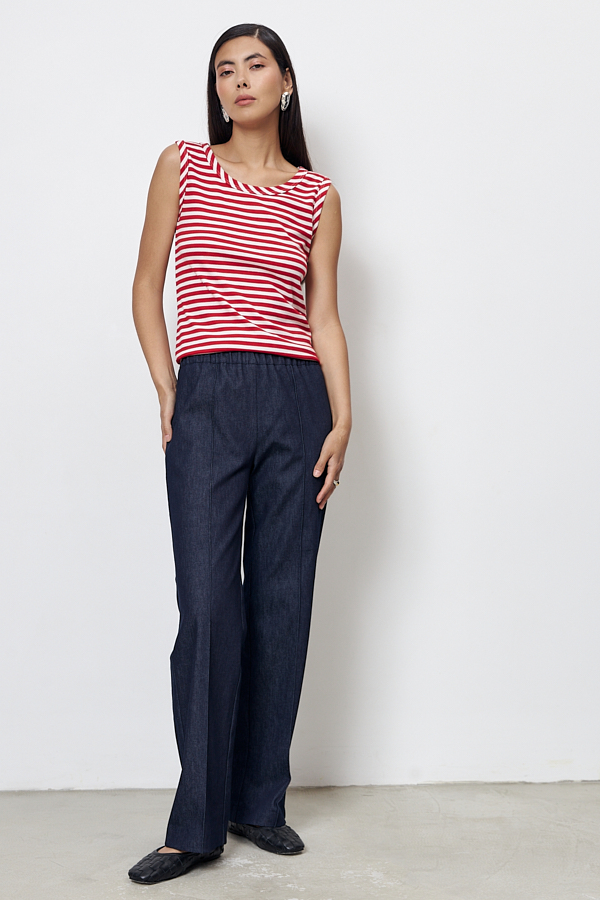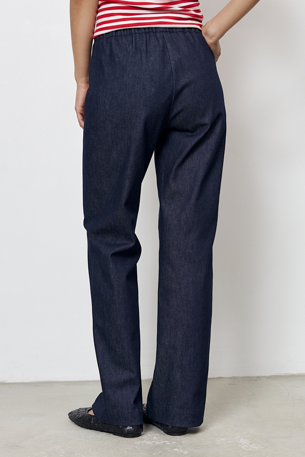 Брюки прямого силуэта из хлопковой ткани. Пояс притачной с эластичной резиной. На передней части брюк застрочены стрелки.