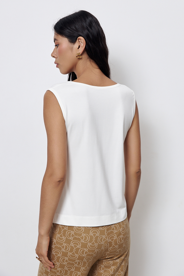 Топ из эластичного полотна полуприлегающего силуэта. Линия горловины и линия проймы окантованы эластичной бейкой.