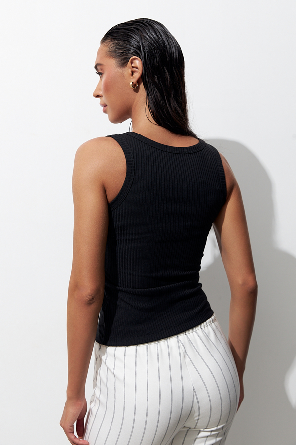 Топ на лямках из эластичного полотна в рубчик. Прилегающий силуэт. Линия горловины и линия проймы окантованы эластичной бейкой.