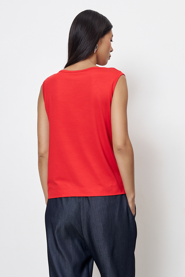 Топ из эластичного полотна полуприлегающего силуэта. Линия горловины и линия проймы окантованы эластичной бейкой.
