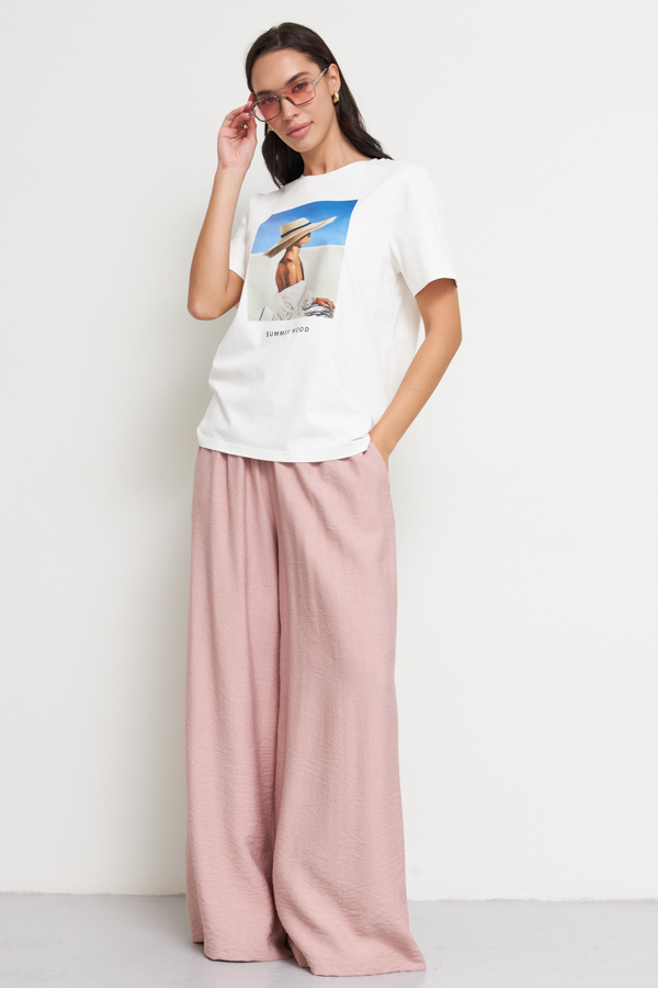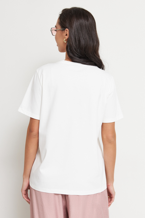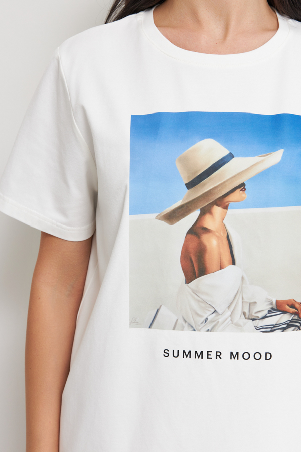 Джемпер из хлопкового эластичного полотна свободного силуэта. Втачной короткий рукав. Круглый вырез горловины оформлен бейкой. На передней части изделия нанесён принт методом шелкографии.