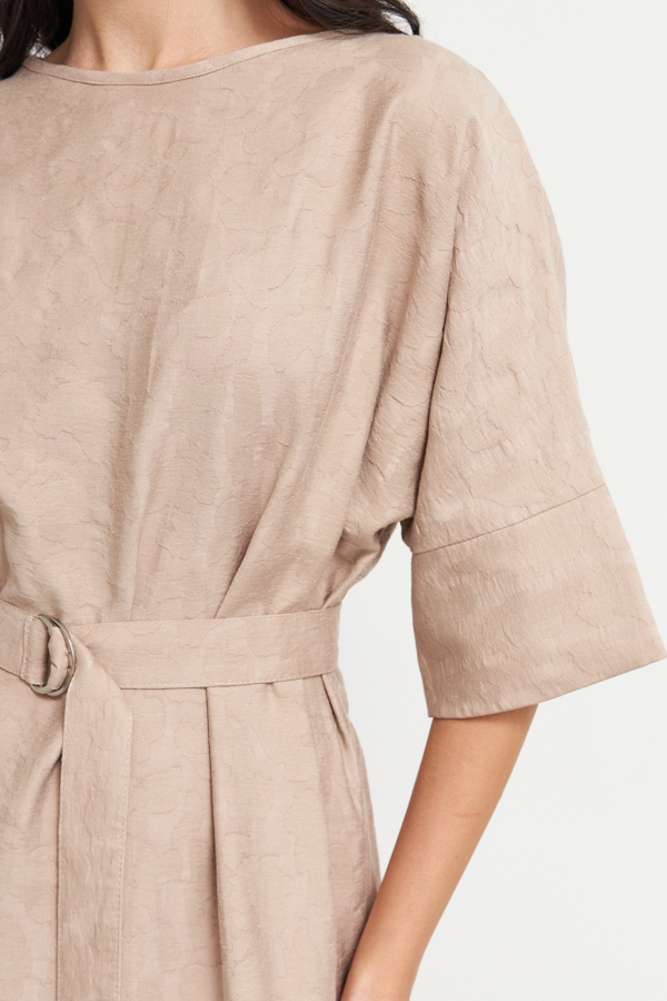 Платье из фактурной вискозной ткани. Свободный силуэт, с разрезом в боковом шве. Круглый вырез горловины окантован косой бейкой из основной ткани. Цельнокроеный рукав с притачной манжетой. В комплекте пояс из основной ткани. В таблице размеров представлены параметры человека, а не изделия.