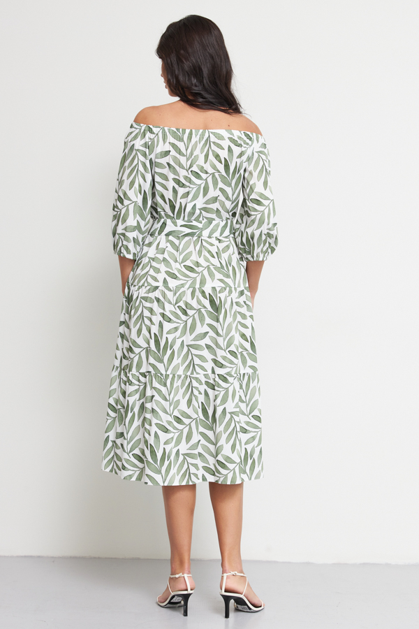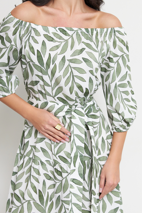 Платье свободного силуэта из плательной ткани, отрезное по линии талии. Нижняя части платья с воланами. Рукав-реглан до локтя. По низу рукава сборка на резину. Линия плеча и линия горловина оформлены сборкой на резину. В комплекте пояс из основной ткани.