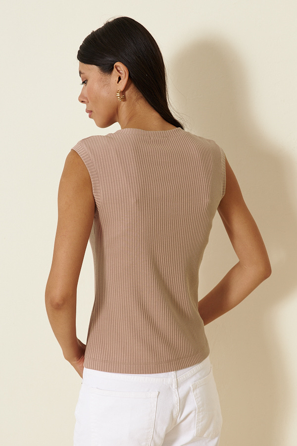Джемпер прилегающего силуэта из эластичного полотна в рубчик. V-образный вырез горловины и линия проймы оформлены бейками.