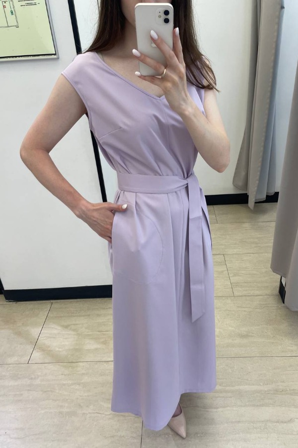 Платье полуприлегающего силуэта, чуть расширенное книзу из вискозной плательной ткани. По центру передней и задней части изделия выполнен шов. V-образный вырез горловины и линия проймы оформлены косыми бейками. Низ изделия асимметричной длины (спинка чуть удлинена относительно переда). В боковых швах карманы с настроченным контуром. В комплекте пояс из основной ткани.
