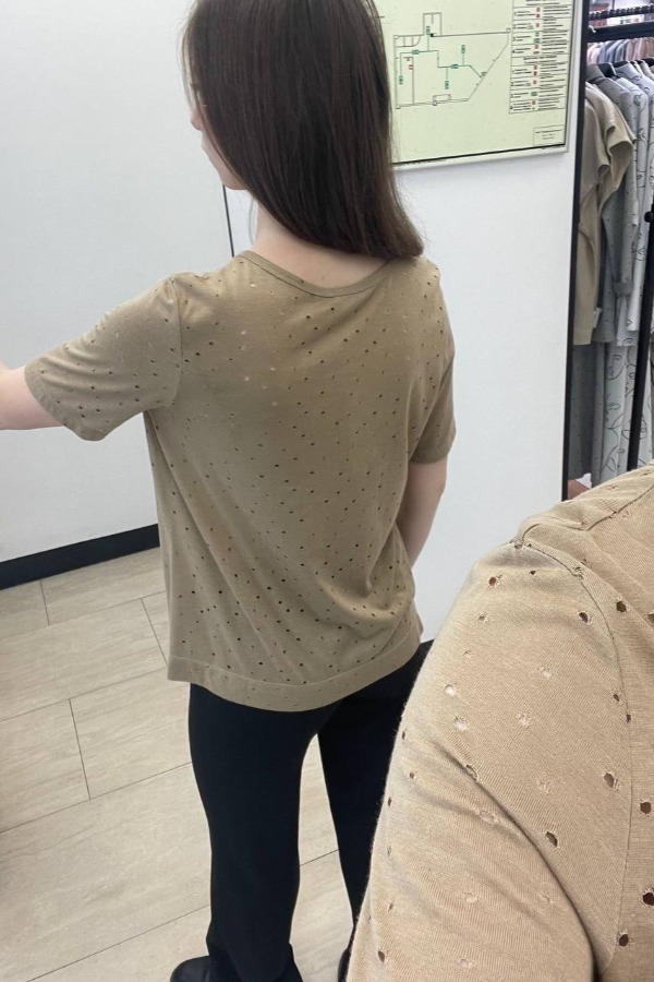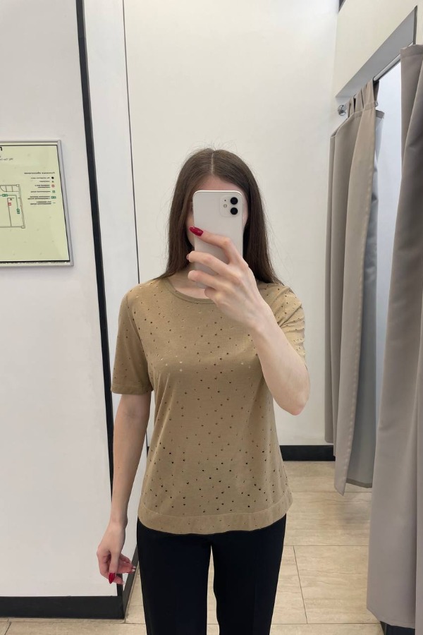Джемпер из эластичного полотна с перфорацией. Изделие свободного силуэта. Втачной короткий рукав. Вырез горловины окантован эластичной бейкой. Джемпер – это хорошая базовая вещь, подходящая для любого гардероба.