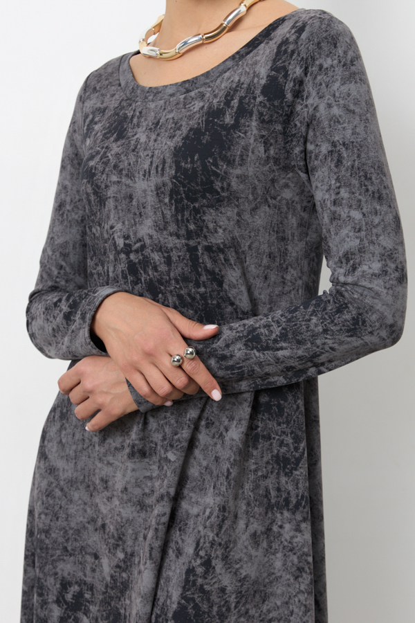 Платье из эластичного полотна полуприлегающего силуэта, расширенное книзу. Втачной длинный рукав. Круглый вырез горловины оформлен притачной бейкой.