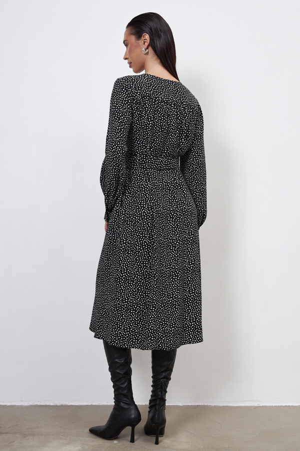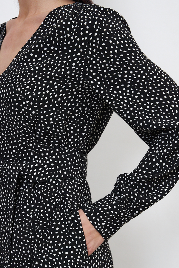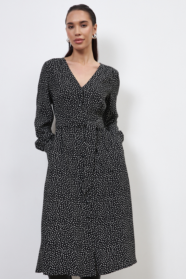 Платье из вискозной ткани свободного силуэта с притачным поясом к талиевым вытачкам. Изделие отрезное по линии талии, на которой заложены защипы. На передней и задней части изделия выполнена двойная кокетка со сборкой. По центру передней части застёжка на пуговицы, в боковых швах карманы. V-образный вырез горловины, визуально делает фигуру стройнее. Втачной длинный рукав на манжете с застёжкой на пуговицы.