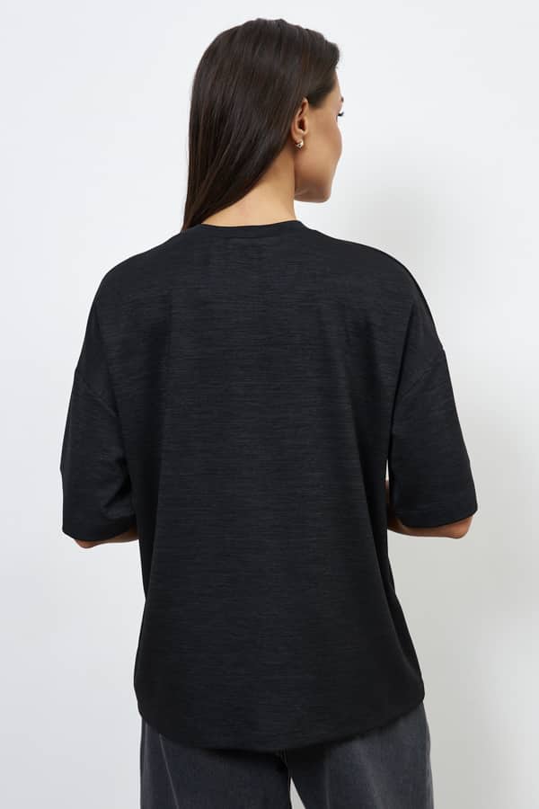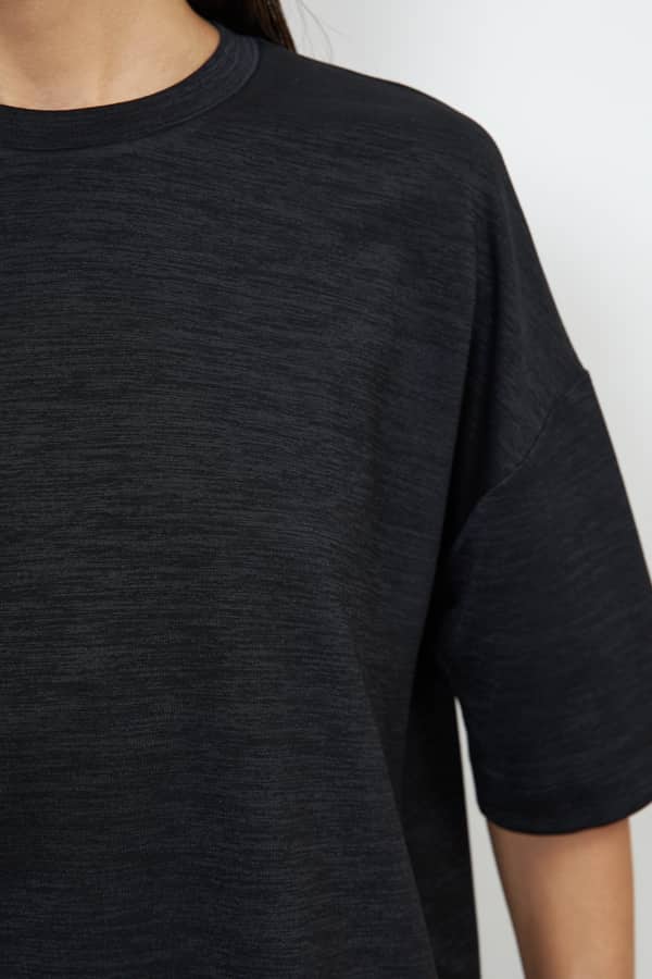 Джемпер свободного силуэта со спущенной линией плеча и рукавом до локтя выполнен из меланжевого эластичного полотна. Вырез горловины оформлен бейкой из основной ткани. В таблице размеров представлены параметры человека, а не изделия.