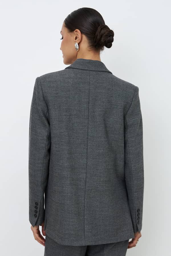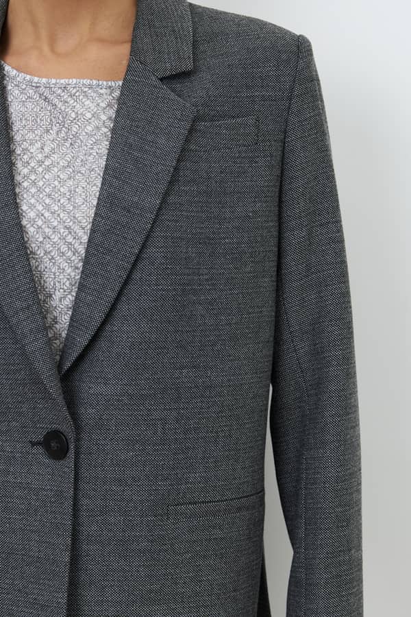 Жакет из костюмной ткани. Прямой силуэт с разрезами в боковых швах. Изделие с английским воротником и застежкой на пуговицу. На передней части жакета выполнен нагрудный карман с листочкой и карманы в рамку. Втачной длинный рукав, снизу шлица с пуговицами. Изделие идеально держит форму, имеет четкую линию плеча благодаря плечевым накладкам. Жакет на подкладке.