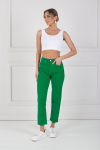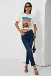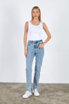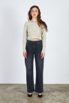 Брюки из денима выполнены по классической джинсовой технологии (варка с эффектом легкого выбеливания). Прямой широкий крой. На задней части брюк выполнены накладные карманы, на передней - карманы с подкройным бочком. Притачной пояс со шлёвками и кулиской. Застёжка на молнию-гульфик и пуговицу.