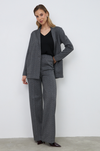Жакет из костюмной ткани полуприлегающего силуэта. Изделие с английским воротником и застежкой на пуговицы. На передней части жакета выполнены карманы в рамку с клапаном. По центру задней части выполнена шлица - элемент декоративный и необходимый. Обеспечивает свободу движения, добавляет шику и элегантности. Длинный рукав, снизу имитация шлицы с пуговицами. Жакет на подкладке.