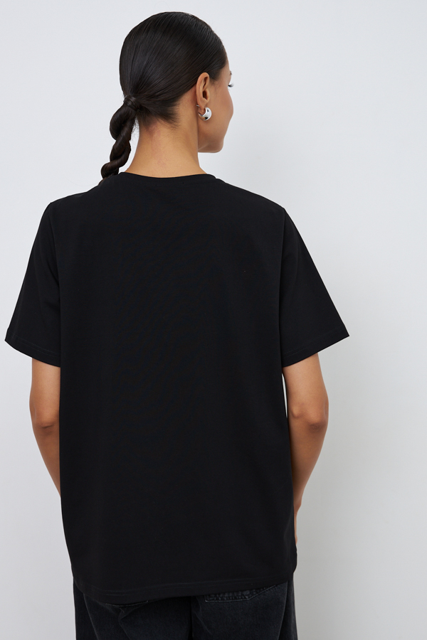 Джемпер из хлопкового эластичного полотна свободного силуэта. Втачной короткий рукав. Круглый вырез горловины оформлен бейкой.