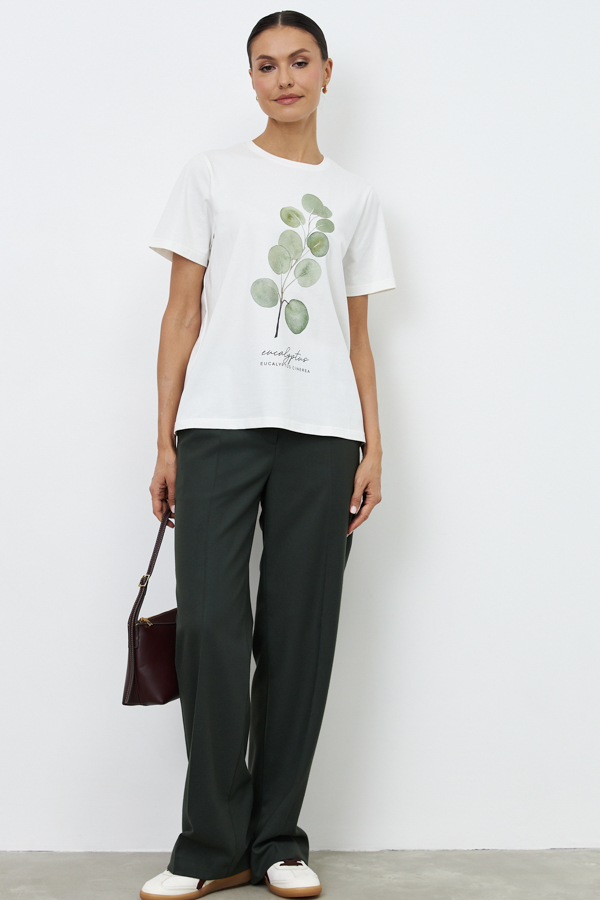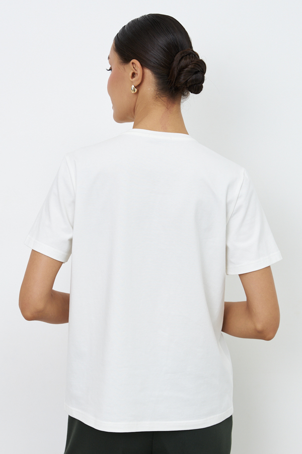 Джемпер свободного силуэта из хлопкового эластичного полотна. Втачной короткий рукав. Круглый вырез горловины оформлен бейкой.