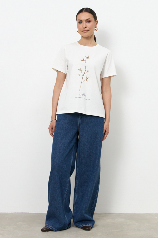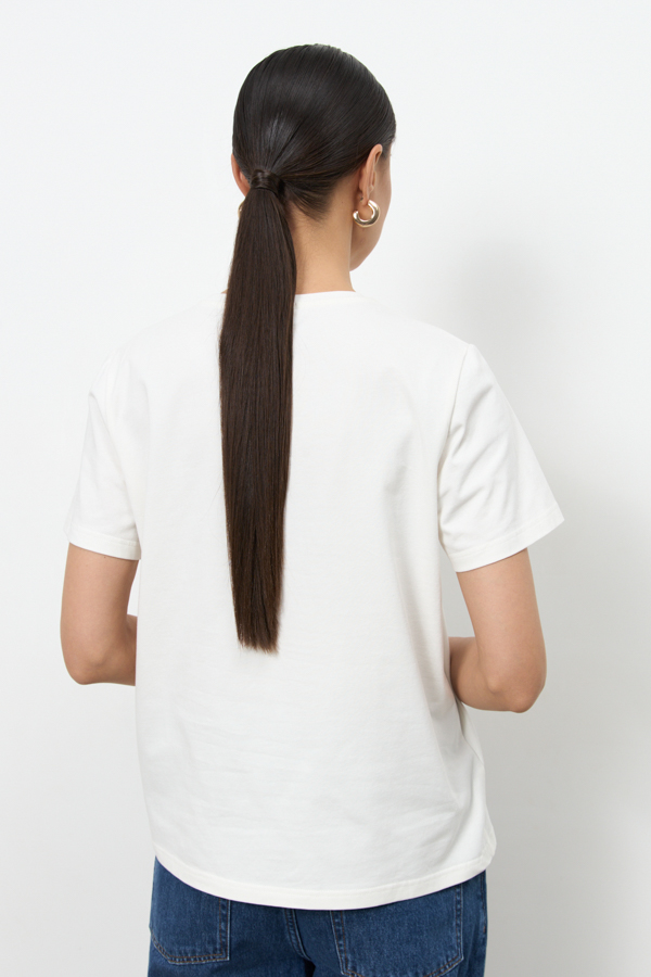 Джемпер свободного силуэта из хлопкового эластичного полотна. Втачной короткий рукав. Круглый вырез горловины оформлен бейкой.