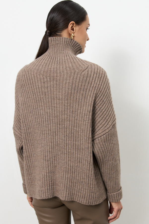 Джемпер свободного силуэта со спущенной линией плеча и длинным рукавом. Линия горловины оформлена высокой стойкой. Изделие выполнено из мягкой пряжи.