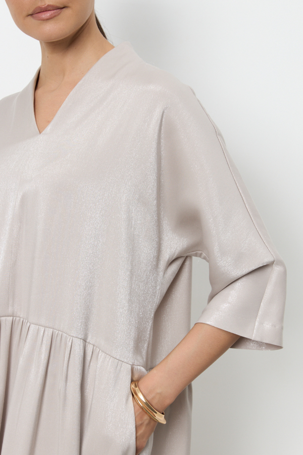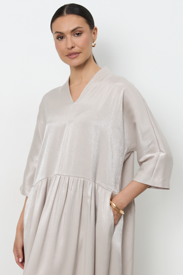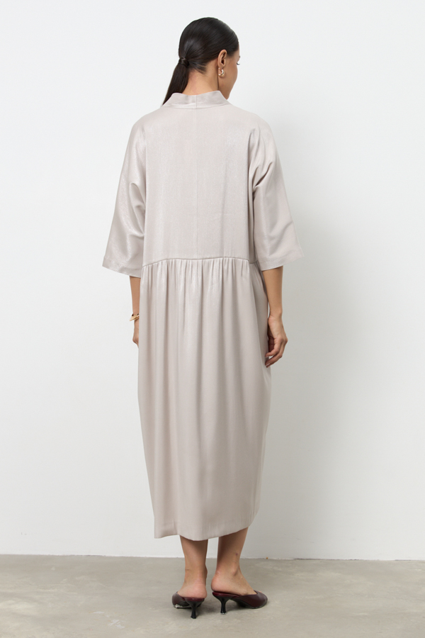 Платье из вискозной ткани очень свободного силуэта. Изделие отрезное чуть ниже линии талии, со сборкой на юбке и подрезными карманами. Цельнокроеная стойка, переходящая в V-образный вырез горловины, визуально делает фигуру стройнее. Длинный цельнокроеный рукав. В таблице размеров представлены параметры человека, а не изделия.